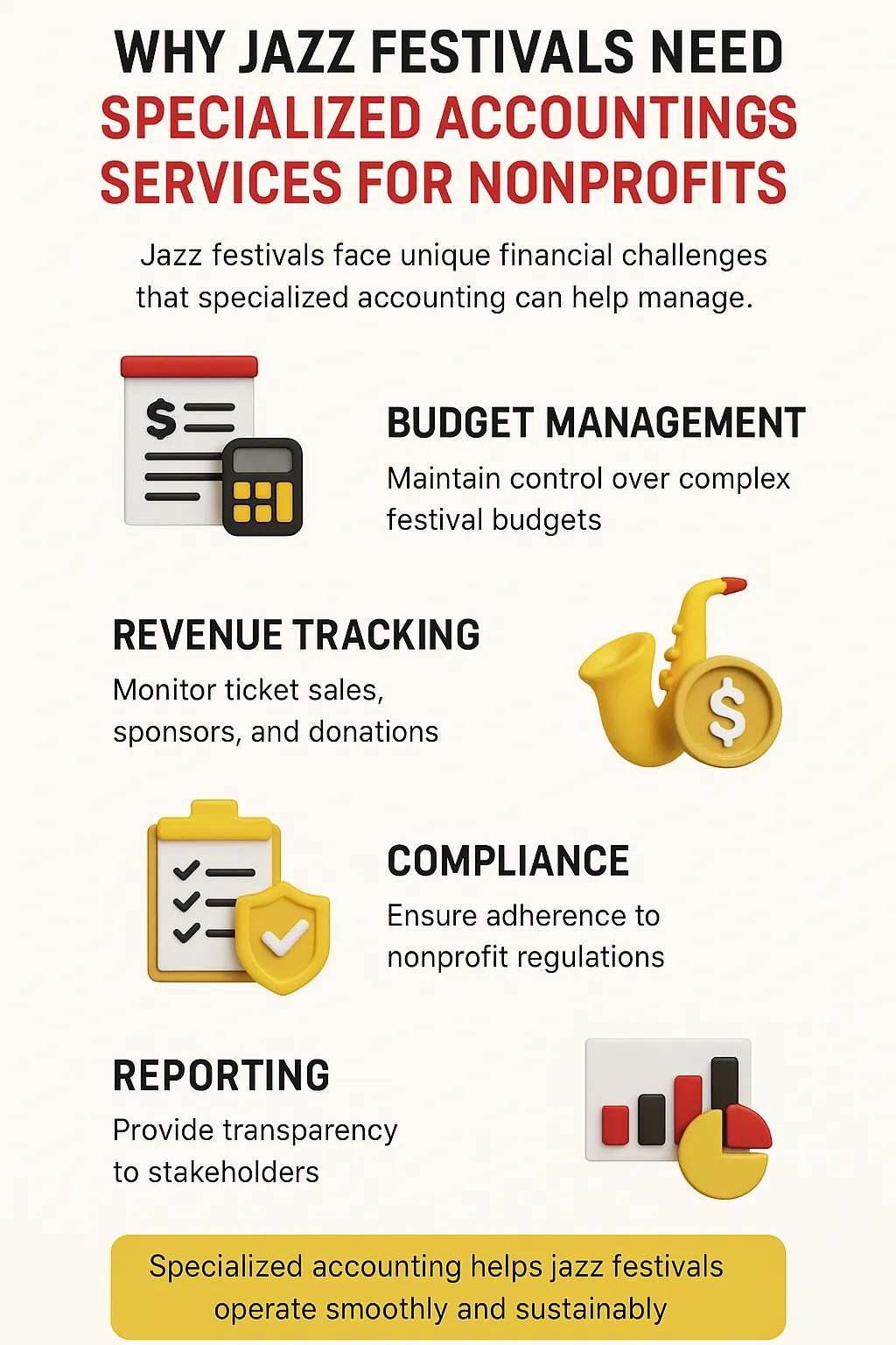 The insight is clear: strong accounting systems are not just an administrative tool. For jazz festivals, especially when supported by accounting services for nonprofits, they are the foundation that protects funding, strengthens trust, and allows the music to continue reaching the community year after year.